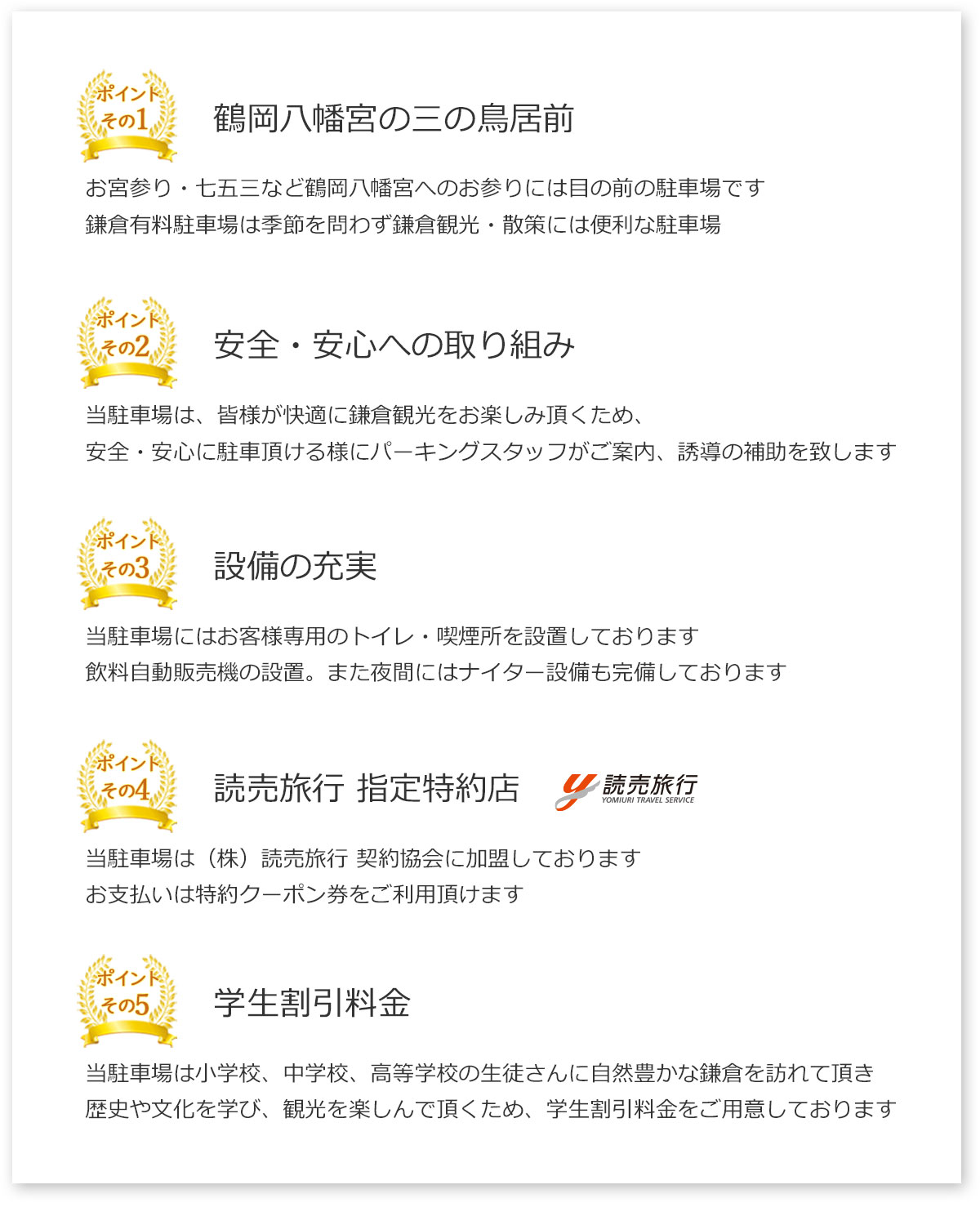 当駐車場は鎌倉の中心地、鶴岡八幡宮の門前に位置し、若宮大路・小町通り商店街へとアクセスの良い駐車場です。団体ツアーのお客様からも大変ご好評頂いております。